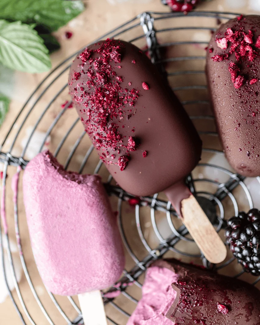 While the bars are freezing, melt the chocolate chips using a double boiler or a heat-safe bowl placed over a pot of simmering water. Stir continuously until smooth. Remove from heat and allow to cool slightly. Once the bars are fully frozen, remove them from the molds. Dip each bar into the melted chocolate to coat, then sprinkle with crushed freeze-dried blackberries while the coating is still wet. Return the coated bars to the freezer for an additional 5–10 minutes to allow the chocolate to fully set. Serve immediately or store in an airtight container in the freezer for up to 2 weeks. Enjoy!